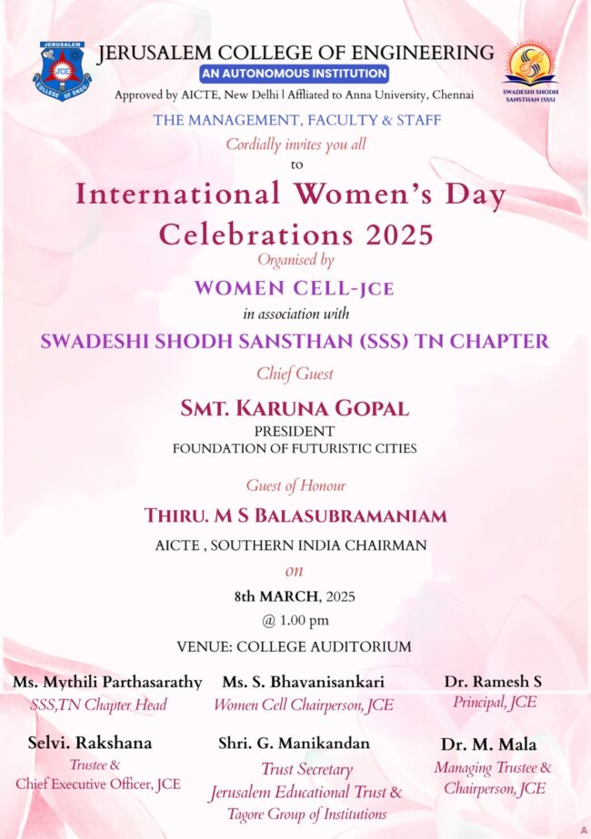 Celebration of International Women’s day at Jerusalem engg college, Chennai. Press release Release 1 Release 2