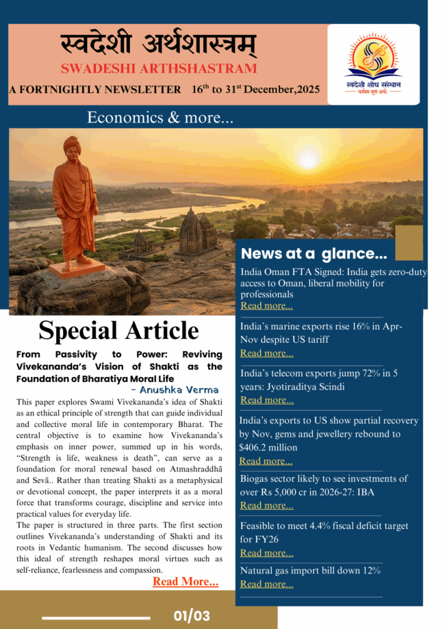 Anushka Verma Researcher Swadeshi Shodh Sansthan From Passivity to Power: Reviving Vivekananda’s Vision of Shakti as the Foundation of Bharatiya Moral Life Abstract: This paper explores Swami Vivekananda’s idea of Shakti as an ethical principle of strength that can guide individual and collective moral life in contemporary Bharat. The central objective is to examine…