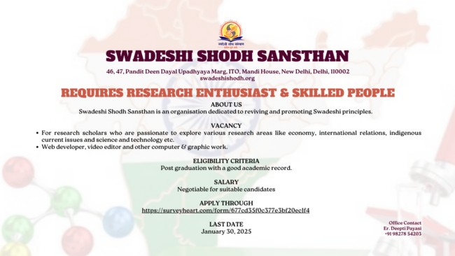Namaste Everyone, 🌸 Swadeshi Shodh Sansthan (New Delhi) is pleased to invite applications from enthusiastic individuals who are passionate about contributing to research and skill-based projects aligned with Swadeshi principles. We are currently seeking Research Scholars and skilled professionals in various domains. 🔍 VACANCY AT SWADESHI SHODH SANSTHAN 1️⃣ Researchers 2️⃣ Web Developers, Computer &…