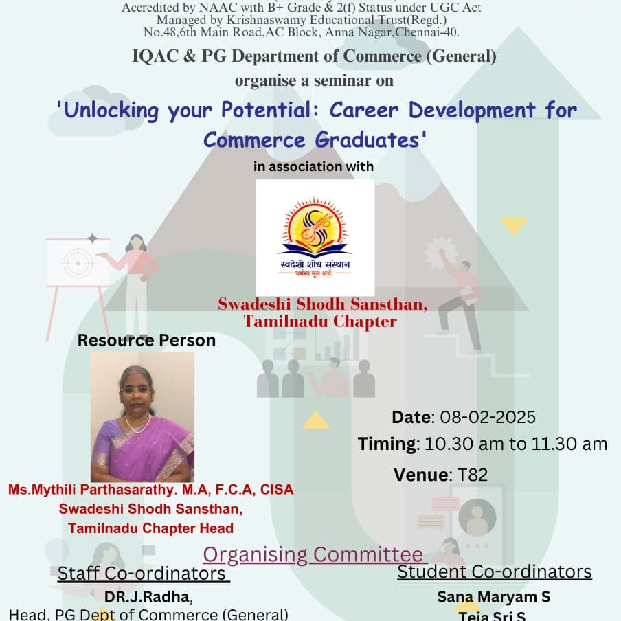 Career guidance was given to PG students of Krishna Swamy college for women at Anna Nagar. A session on Career guidance for commerce postgraduate students by the chapter head. Category: Events - Tamil Nadu ChapterBy support@swadeshishodhApril 20, 2025 Author: support@swadeshishodh Post navigationPreviousPrevious post:Session on Cybersecurity at Rover college PerambalurNextNext post:Seminar at Srimad Andavan Arts and Science collegeRelated PostsEvent on AI at TCE MaduraiApril 20, 2025Jagriti at SRM vadapalani campusApril 20, 2025Panel discussion held on AI at SRIMSTApril 20, 2025Seminar at Srimad Andavan Arts and Science collegeApril 20, 2025Session on Cybersecurity at Rover college PerambalurApril 20, 2025Session on Cybersecurity in MOPApril 20, 2025