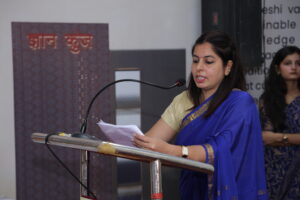 Following his address, Dr. Himani began the session with an invocation of the Gayatri Mantra, setting an elevated spiritual tone for the deliberations. She greeted the audience with “Sarvebhyo Namo Namah” and introduced the panel of experts, including eminent academicians, industry practitioners, and policy thinkers. Her remarks underscored the importance of combining knowledge, innovation, and discipline to realize the dream of “Viksit Bharat @ 2047.”